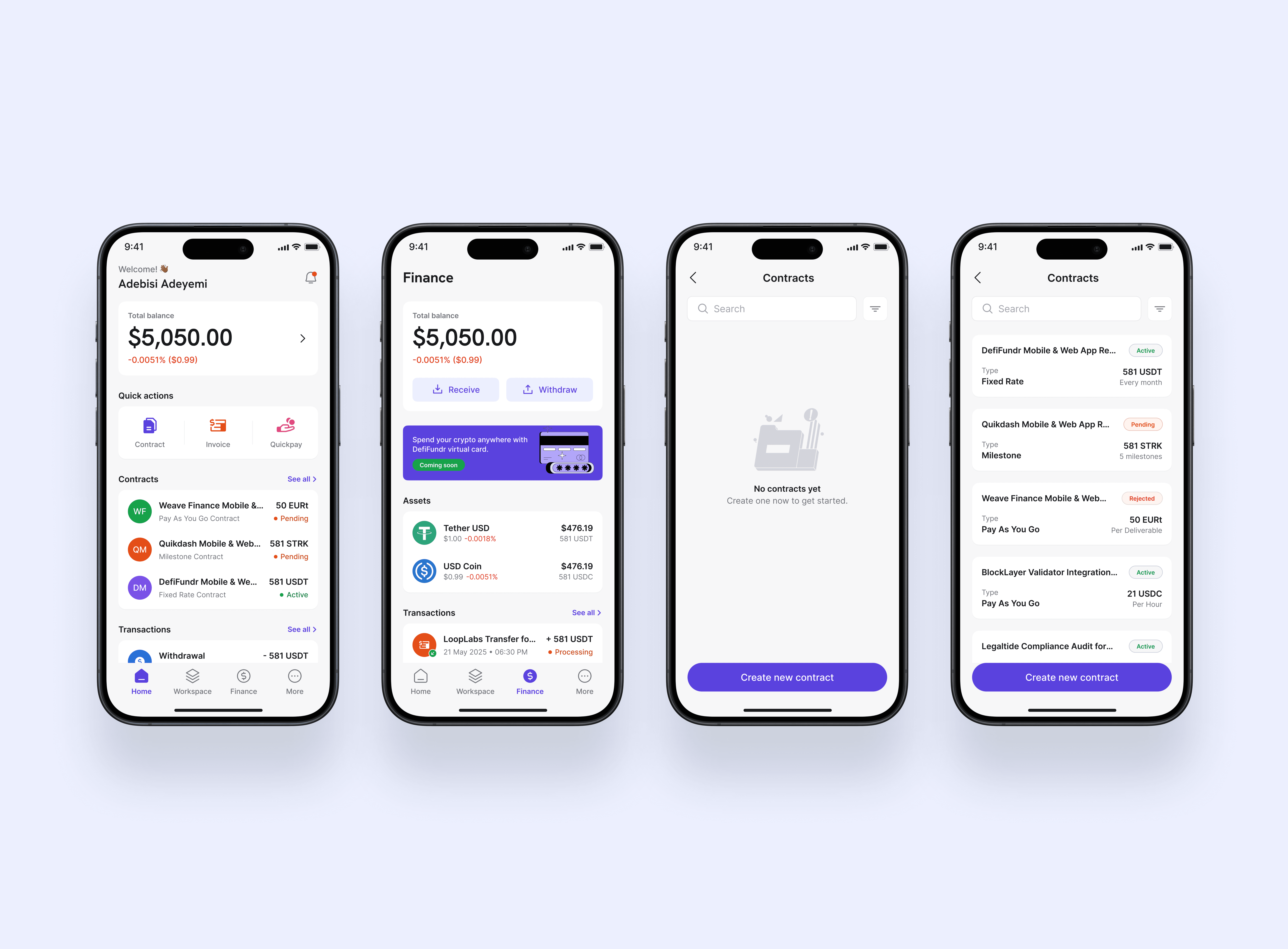 In 2025, I designed the mobile MVP for DefiFundr, a decentralized platform that reimagines payroll and invoicing for the modern gig economy. The project aimed to solve the liquidity friction contract workers face daily by leveraging blockchain technology to offer an immediate alternative to slow traditional banking. As a product designer who understands the nuances of freelancing, I knew that for this to work, the tech had to disappear, leaving only a seamless experience of getting paid.